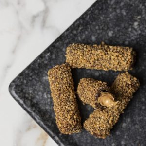 To figlarna, finezyjna rurka waflowa z bogatym nadzieniem kremu z masła orzechowego, otulona czekoladową polewą i chrupiącym krokantem orzechowym. Ten wyjątkowy deser narodził się i został dopracowany w rodzinnej tradycji Biscotti Tsoungari.